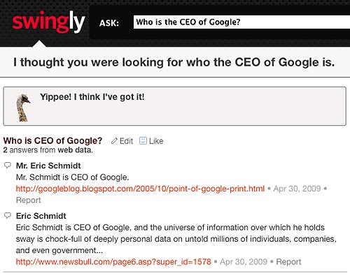 Например, Swingly правильно отвечает на вопрос «Who is CEO of Google?» («Кто является гендиректором Google?») или «What was the first video on MTV?» («Какой клип был первым на MTV?»).