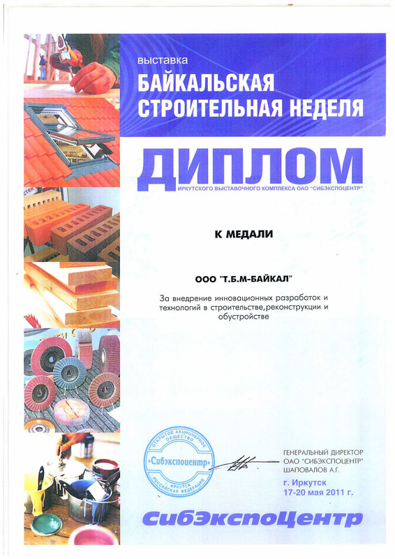 По итогам выставки компания ТБМ-Байкал награждена медалью и дипломом «За внедрение инновационных разработок и технологий в строительстве, реконструкции и обустройстве».