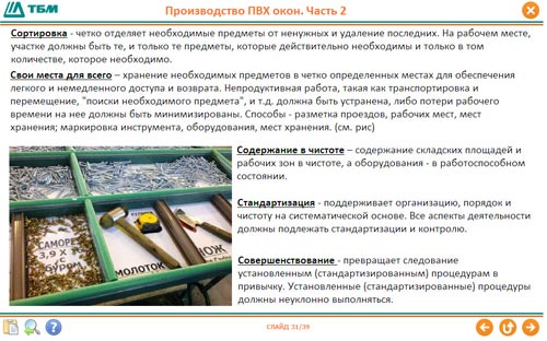 Постоянные улучшения производственных процессов невозможно проводить без новых знаний и умений персонала компании. В связи с этим Корпоративный университет разработал электронный курс для своих клиентов и их дилеров «Основы производства ПВХ окон». Целью данного курса является повышение уровня компетентности персонала компании - производителя окон ПВХ за счет понимания общих принципов организации оконного производства, направленных на минимизацию потерь и соответствующее сокращение издержек. На примере типового производства предложены три уровня согласованных ключевых показателей компании, цеха и рабочего места, отражающих степень достижения целей улучшений и уровень совершенства процессов. Рассмотрены принципы организации бережливого производства и способы их реализации.
