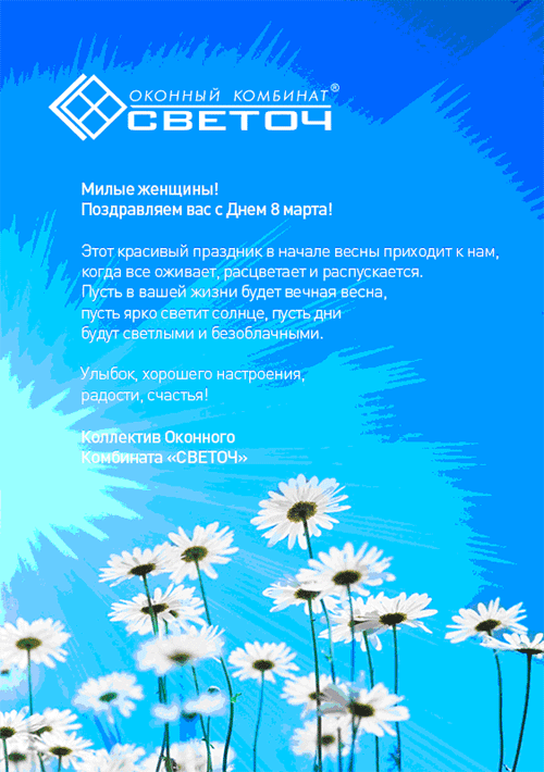 Оконный Комбинат «СВЕТОЧ» поздравляет всех женщин с Праздником 8 Марта!