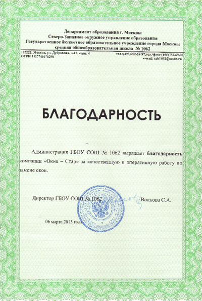 Администрация школы №1062 г. Москвы выражает благодарность компании за качественный монтаж пластиковых окон.