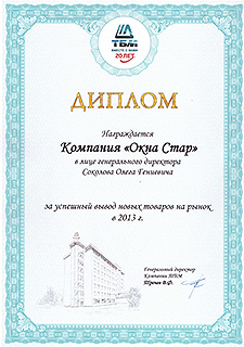 Компания «ТБМ» – крупнейший в России поставщик комплектующих и материалов для оконного производства – наградила компанию почетным дипломом за успешный вывод на рынок новой продукции в 2013 г.