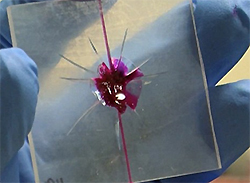 «Теперь химикалии поступают к разрыву двумя раздельными потоками. Затем повреждение закрывается с помощью двухступенчатой реакции. Сначала химикалии формируют на месте разрыва гелевое покрытие, которое затем медленно застывает, образуя твердую структуру.
