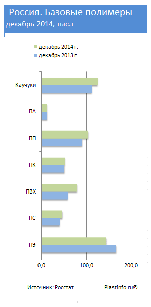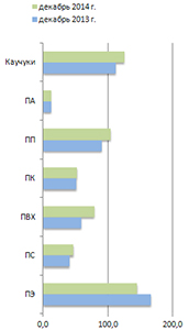 Полиамида (ПА) в декабре было наработано в объеме 12 тыс. т, это меньше по сравнению с декабрем 2013 года на 1,5%. Всего за двенадцать месяцев 2014 года было выпущено 145 тыс. т этого полимера (рост – 4,6%). Выпуск поликарбоната (ПК), простых и сложных полиэфиров, алкидных и эпоксидных смол в отчетном периоде составил 52,2 тыс. т (+ 1,7% к показателю прошлого года), а производство синтетических каучуков в декабре составило 125 тыс. т(+ 11,7% к показателю прошлого года).