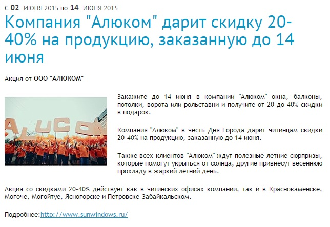 Новостная лента сайта , в отличие от многих не новостных сайтов, «живая» и регулярно обновляющаяся, в первую очередь, благодаря нашим партнерам. Вместе с тем, мы прекрасно понимаем, что наибольший интерес для основной части посетителей нашего сайта являются именно акции и специальные предложения для покупателей.