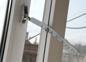 7. Гребёнка (ограничитель открывания) – фиксирует открытую створку окна в заданном положении, устанавливать её лучше вверху, так, чтобы ребёнок не смог до неё дотянуться.